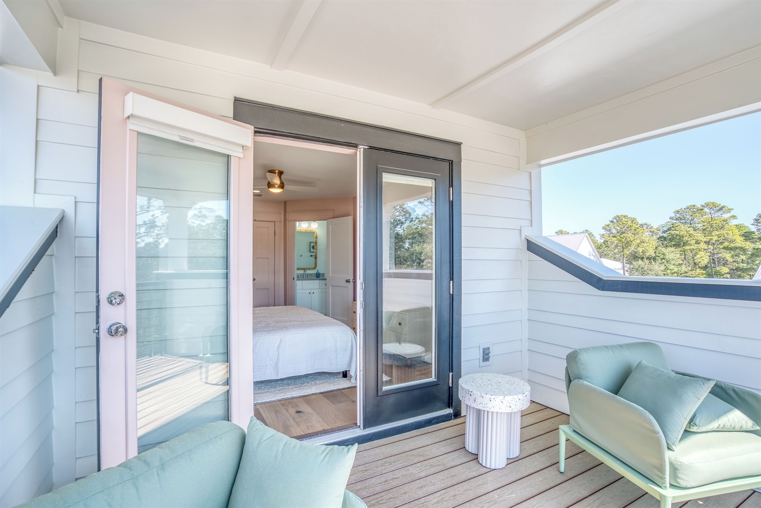 The carriage home has 2 queen suits on the second floor with attached bathrooms. Downstairs you will find a lounge with 83” tv and mini fridge, along with extra dining seating. Also attached is a game room with an inside/outside bar with a roll up door. Inside is a ping pong table and dart board along with some seating and barstools.