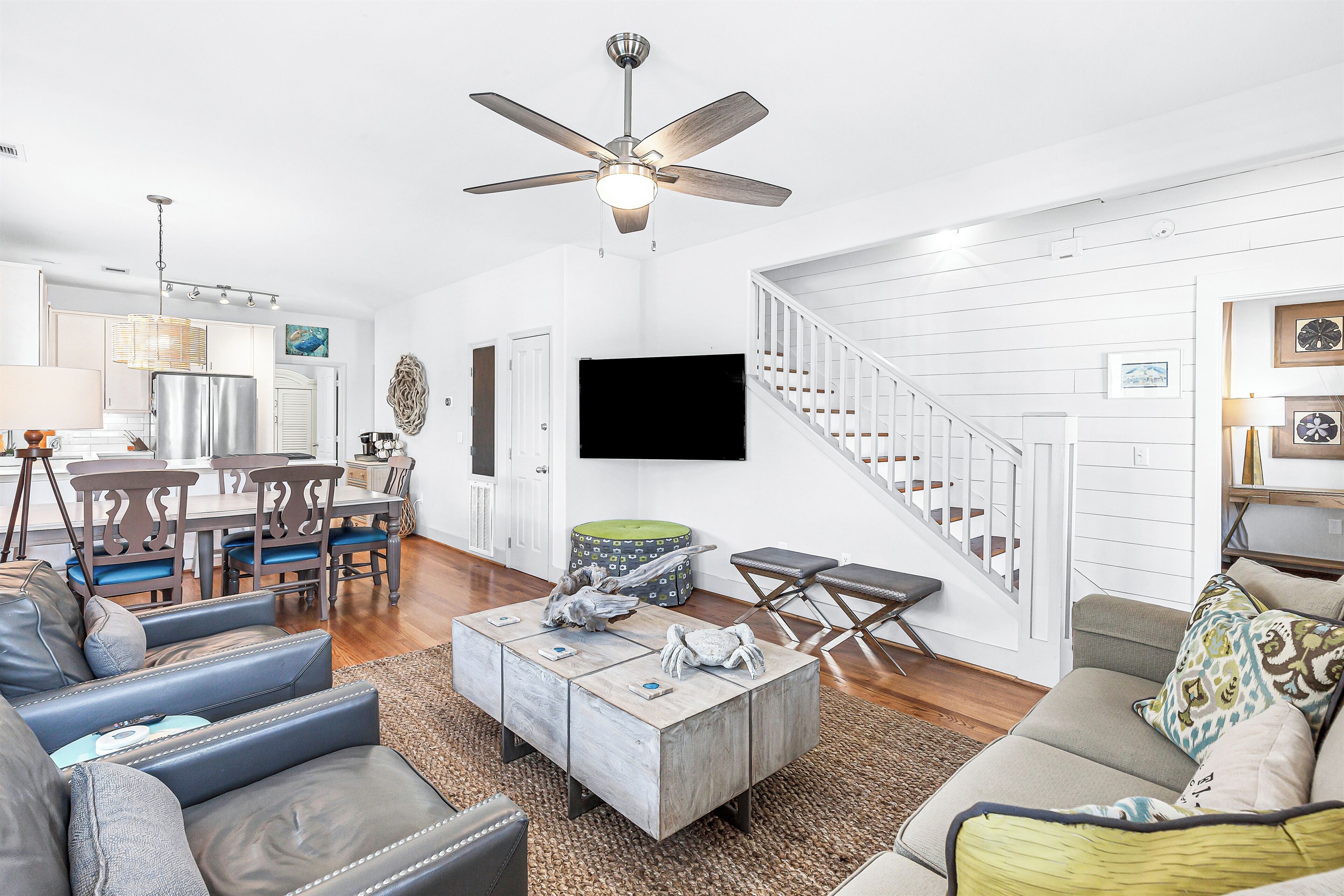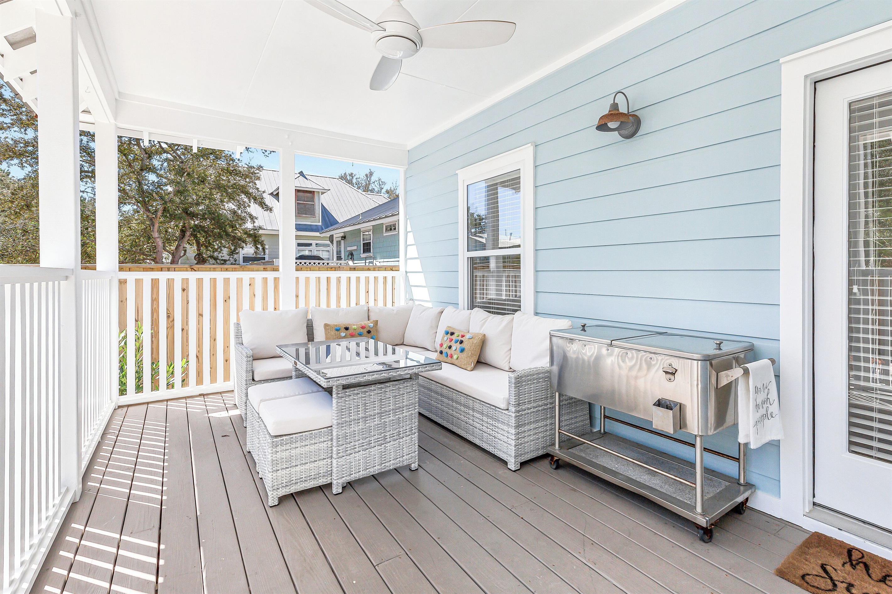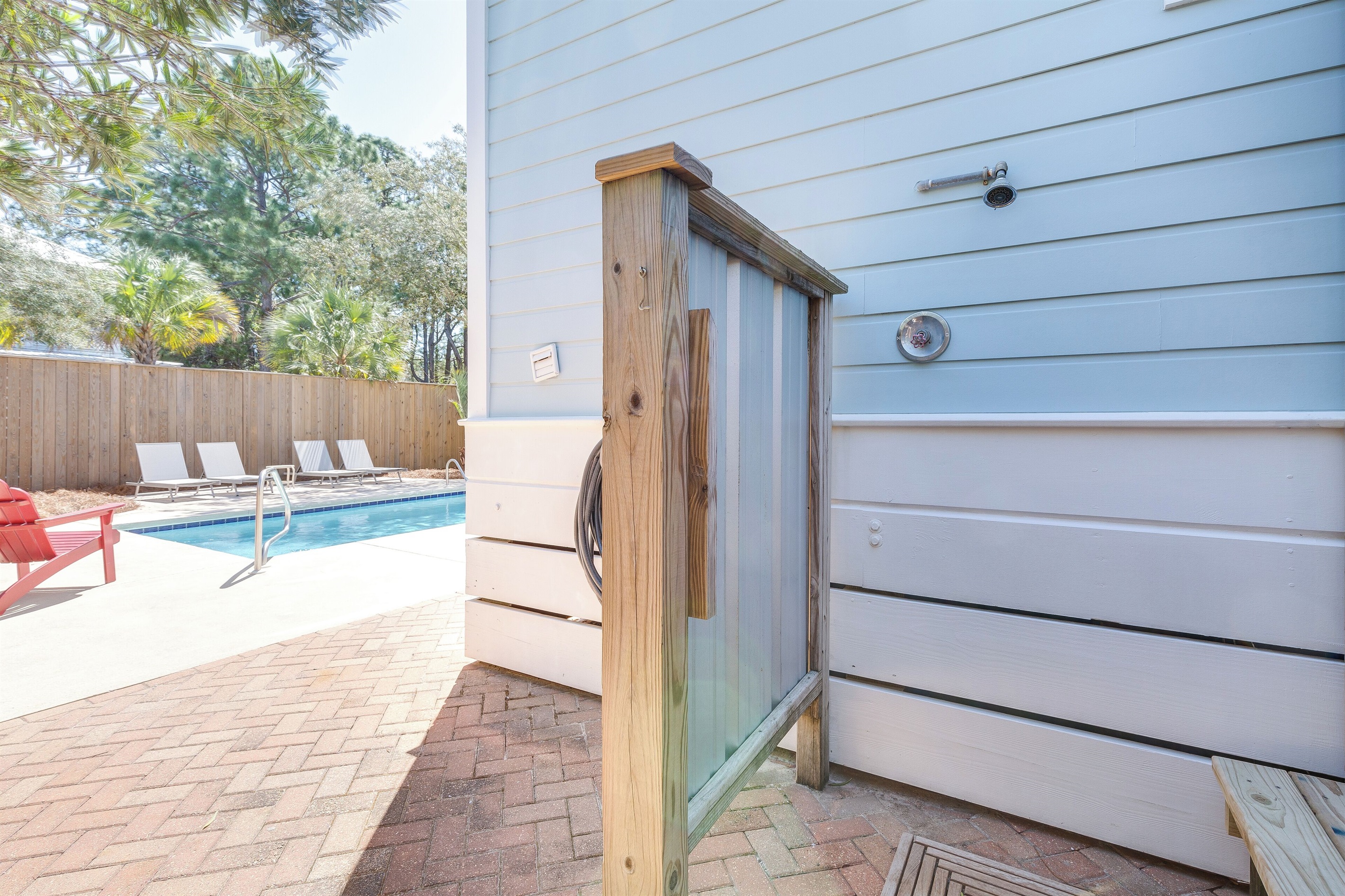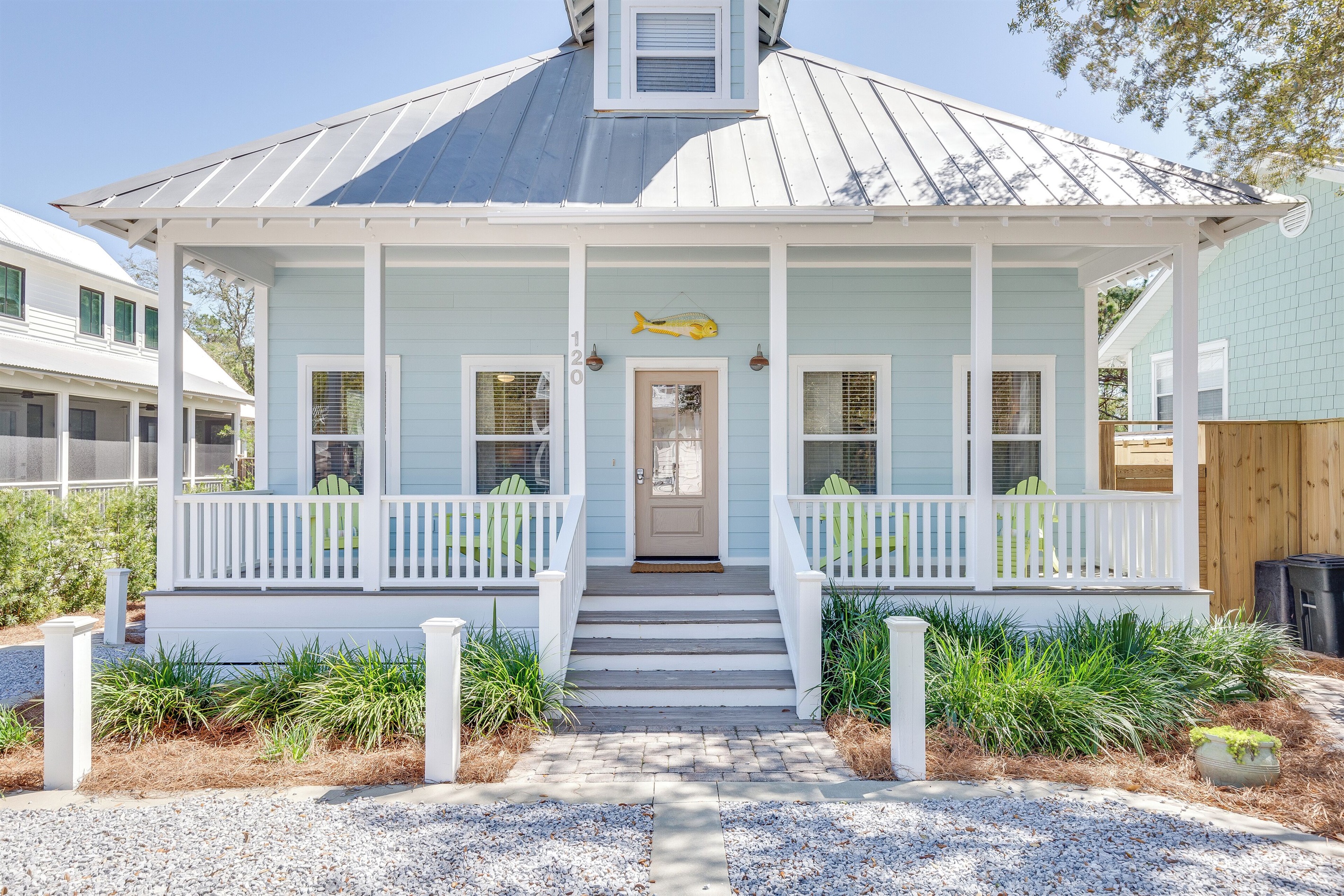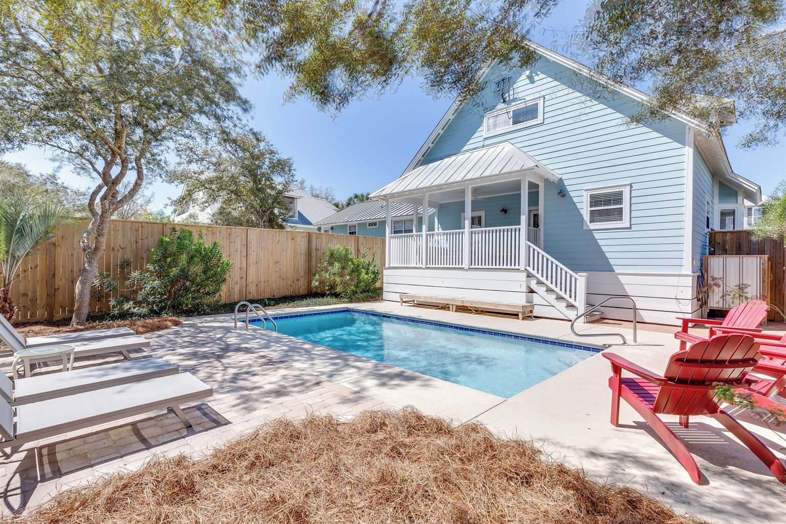 A welcoming front porch with colorful Adirondack chairs greets guests at this cheerful blue beach bungalow. Head inside to find a comfortable living space with a couch, 2 armchairs, and a TV. Past the 6-seat dining table is the open kitchen with a 4-seat breakfast bar perfect for catching up with friends or supervising little ones. Meander onto the back porch, where an inviting arrangement of soft seating encourages lazy afternoons relaxing in the breeze. Head down to the backyard for a refreshing swim in the private pool or an afternoon soaking up sunshine on the loungers. The outdoor shower makes it easy to rinse off after a day at the beach, and there's a barbecue for satisfying post-swim appetites. When the day winds down, guests will find 2 elegant guest bedrooms on this level outfitted with soft king beds. A washer and dryer offer convenience for swimwear and beach towels.