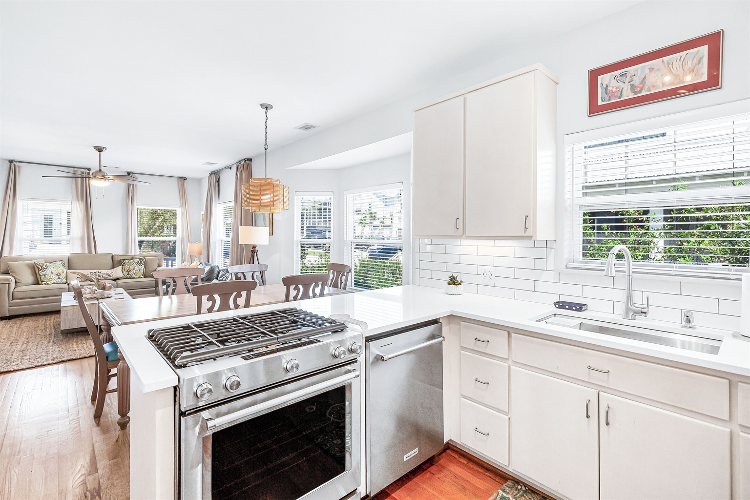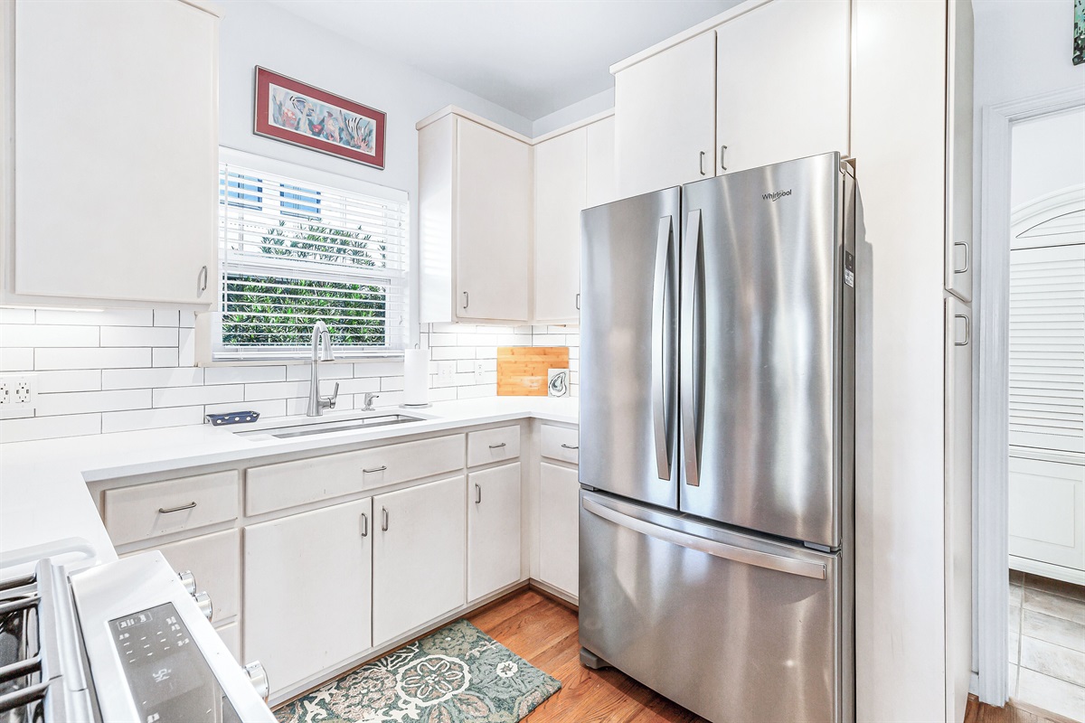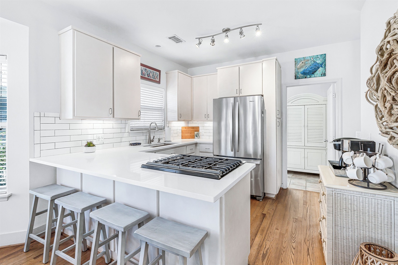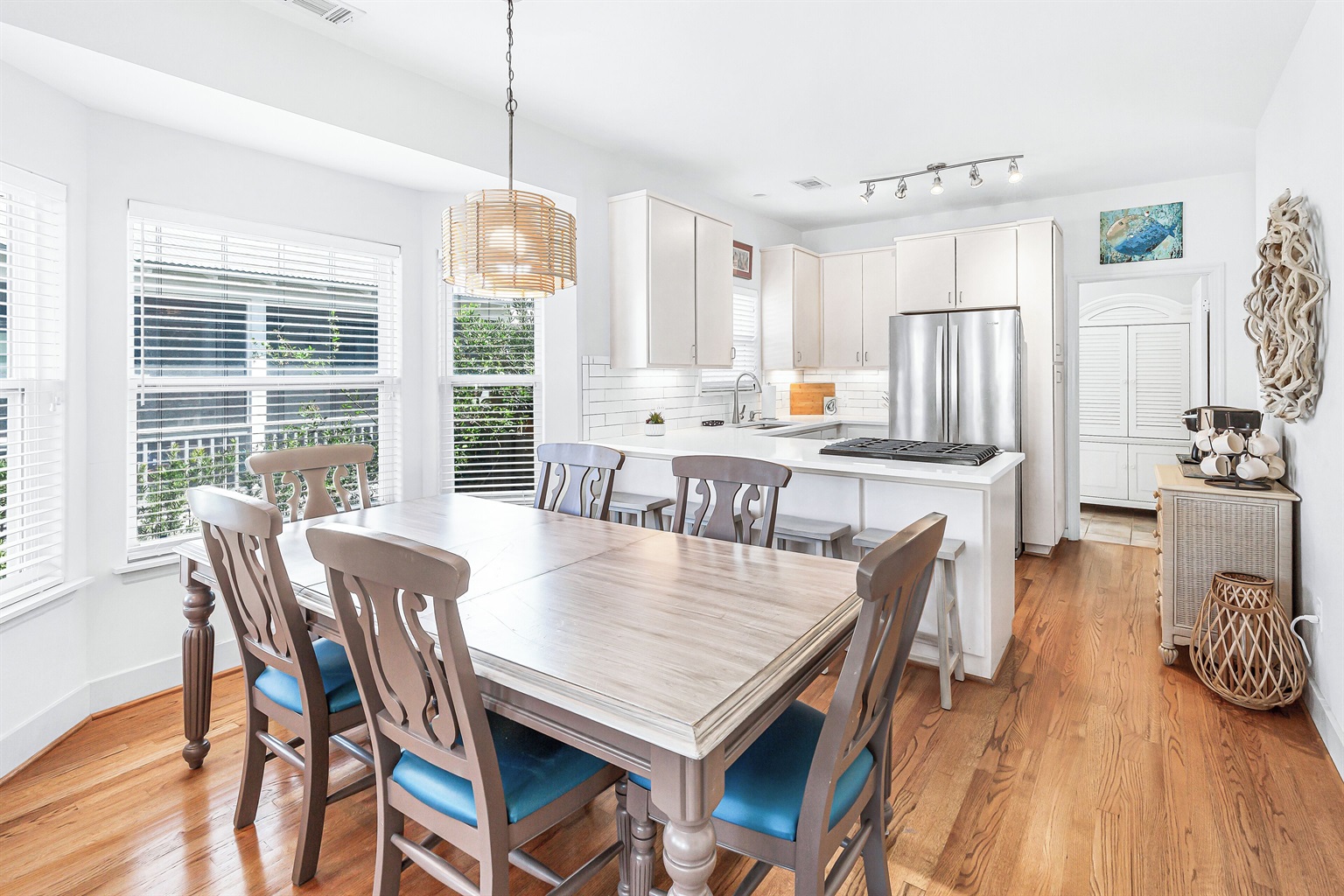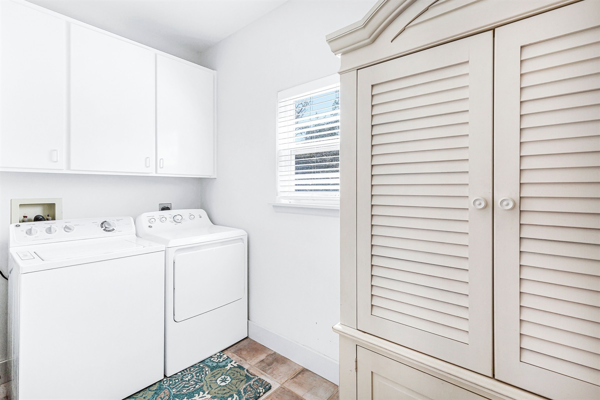 A welcoming front porch with colorful Adirondack chairs greets guests at this cheerful blue beach bungalow. Head inside to find a comfortable living space with a couch, 2 armchairs, and a TV. Past the 6-seat dining table is the open kitchen with a 4-seat breakfast bar perfect for catching up with friends or supervising little ones. Meander onto the back porch, where an inviting arrangement of soft seating encourages lazy afternoons relaxing in the breeze. Head down to the backyard for a refreshing swim in the private pool or an afternoon soaking up sunshine on the loungers. The outdoor shower makes it easy to rinse off after a day at the beach, and there's a barbecue for satisfying post-swim appetites. When the day winds down, guests will find 2 elegant guest bedrooms on this level outfitted with soft king beds. A washer and dryer offer convenience for swimwear and beach towels.