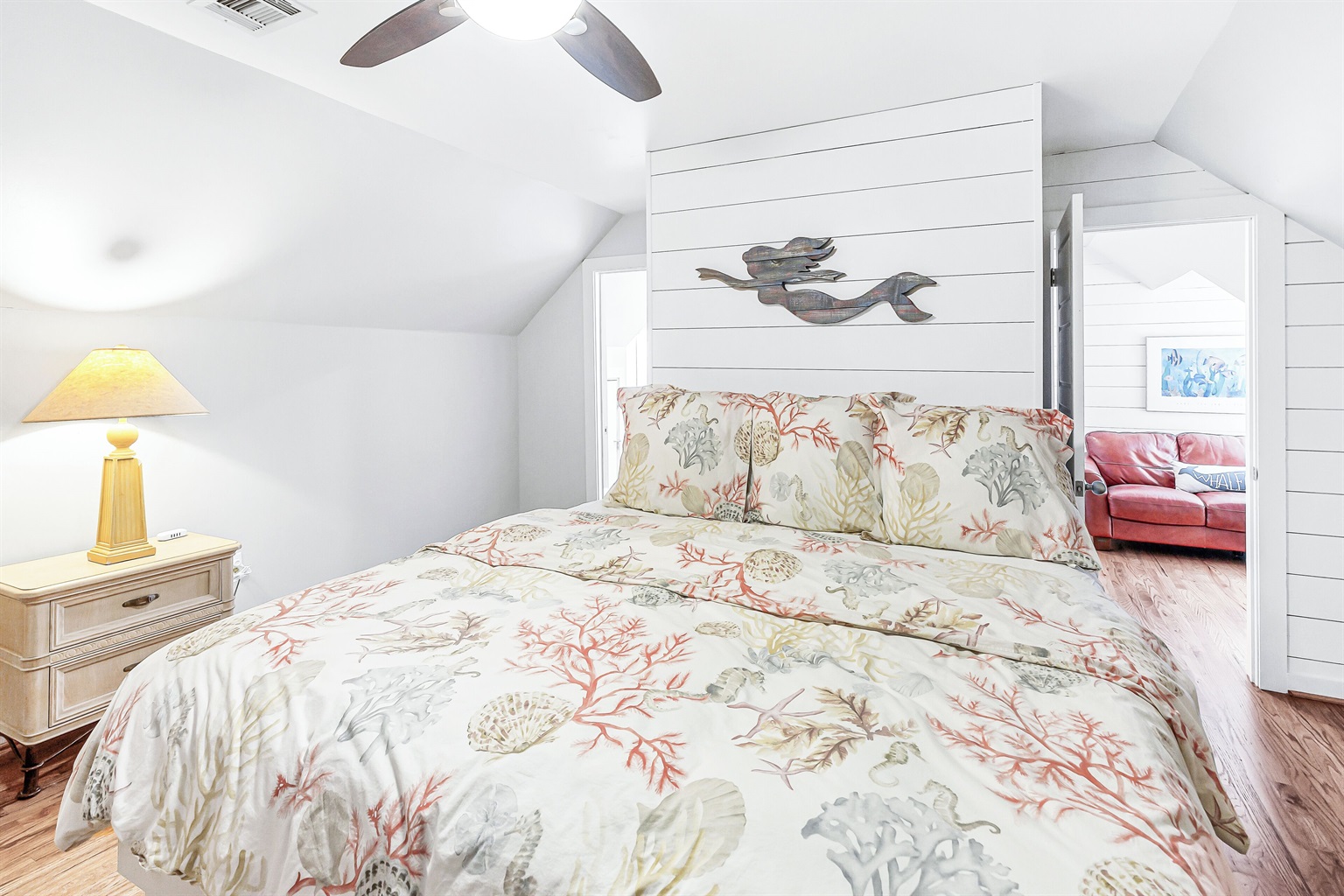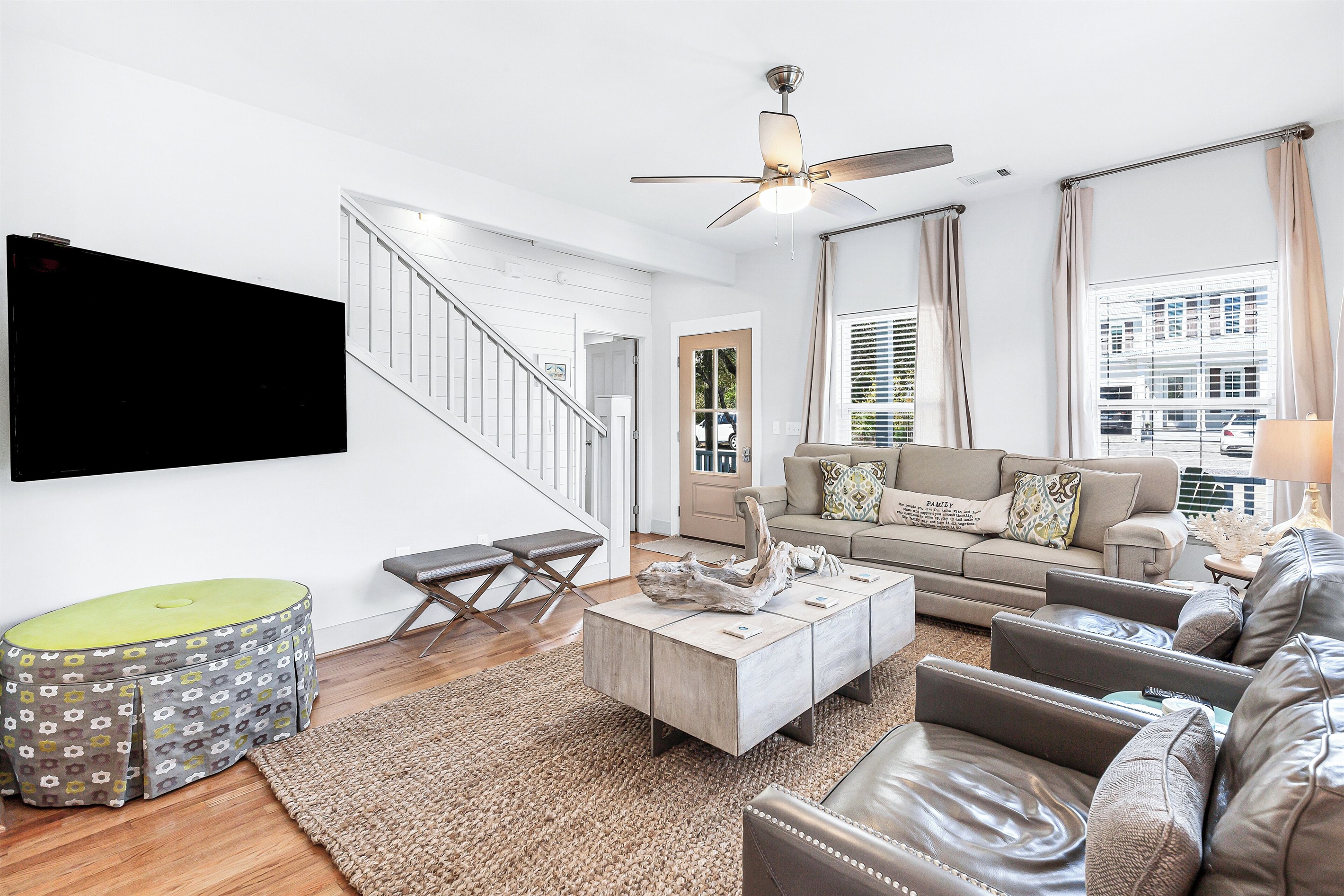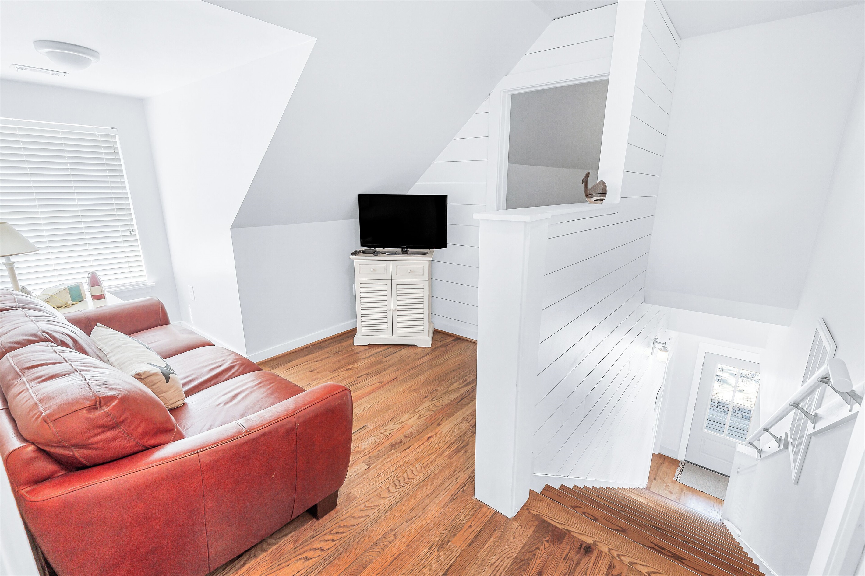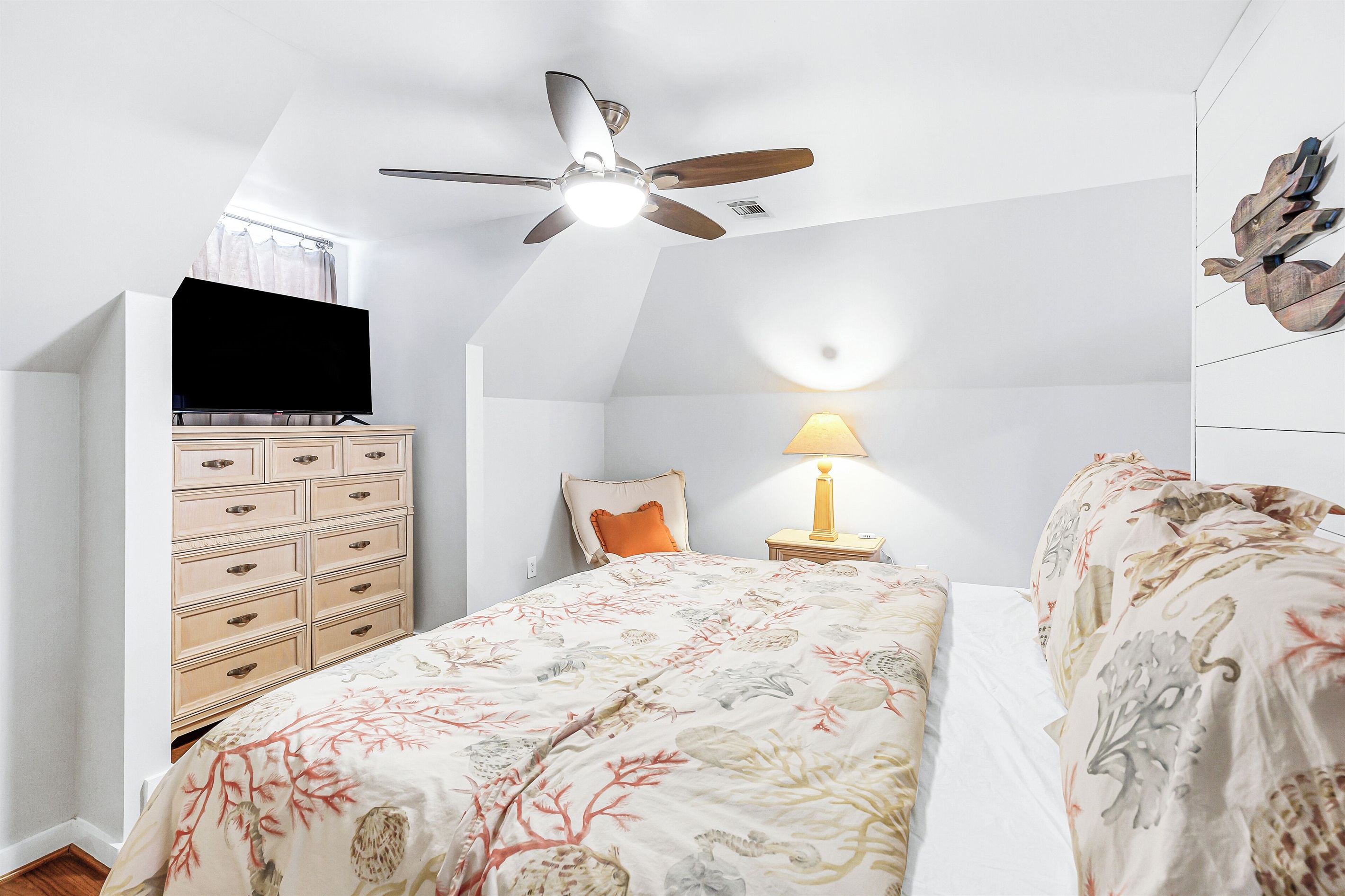 The top-level landing with a TV and plush sofa gives guests space to spread out or works as a kids play area. For sleeping accommodations, this floor hosts 2 guest bedrooms, each with a queen bed and twin trundle.
